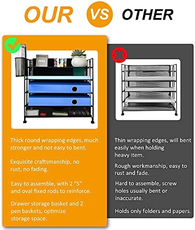 • 【Sturdy Durable】Paper organizer is made of lightweight durable steel wire mesh and reinforced and reinforced with a solid steel frame,very sturdy and will not fade or rust. Rubber anti-slip feet to prevent it from sliding or scratching surfaces. more stable and durable compared with many other similar products in the market.
