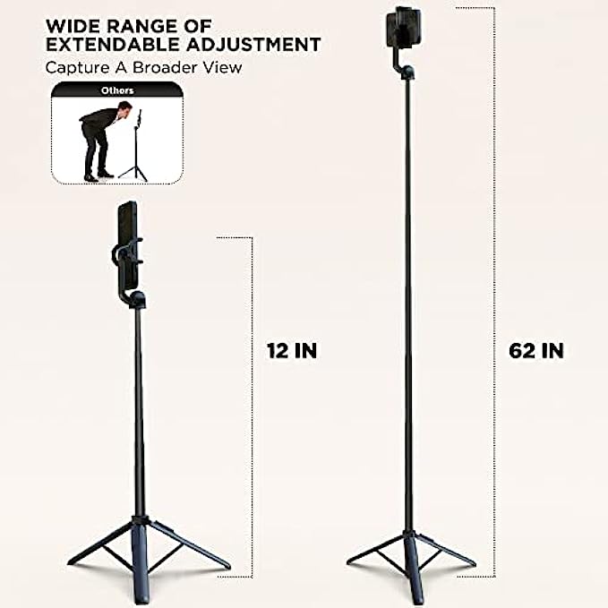 【Extra 62" Adjustable Selfie Stick Tripod】The telescopic pole is made of aluminum alloy, the selfie stick stand is tall enough, adjustable height is 12~62 inches, effortlessly extends. can capture a wider landscape and meet the needs of people who want to have different shoot heights and apply it in different scenes.
