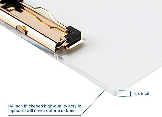 Our Acrylic Clipboard is up to 1/4 inch thick and does not warp or bend. High-end acrylic is as transparent as crystal with a simple and elegant design and it will be a enjoyment to use in your hands