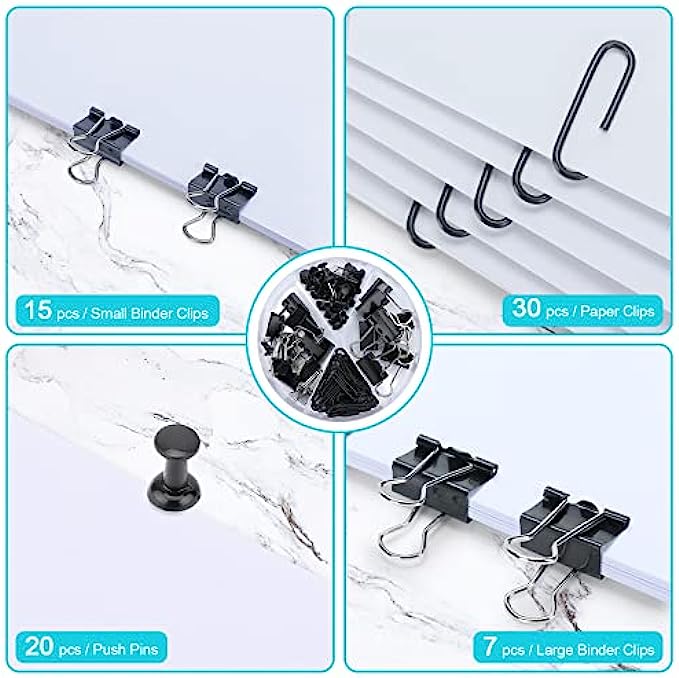 【Powerful storage function】Good size: ( 10.2 x 5.7 x6.2 inches) More storage space for office supplies, This black desk organizers with 7 compartments(5 parts + 2 sliding drawer), and 72 desk Accessories (7pcs large binder clips + 15pcs small binder clips + 20pcs push pins + 30pcs paper clips) for sorting and storage.