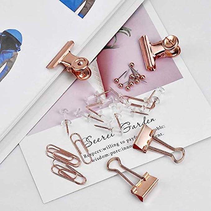 HQDeal 500PCS Rose Gold Office Stationery Set, 100Pcs Push Pins+80Pcs Paper Clips+300Pcs Round Head Pins+14Pcs Binder Clips+6Pcs Bulldog Clips with Push Pins Clips for Home School Office Supplies