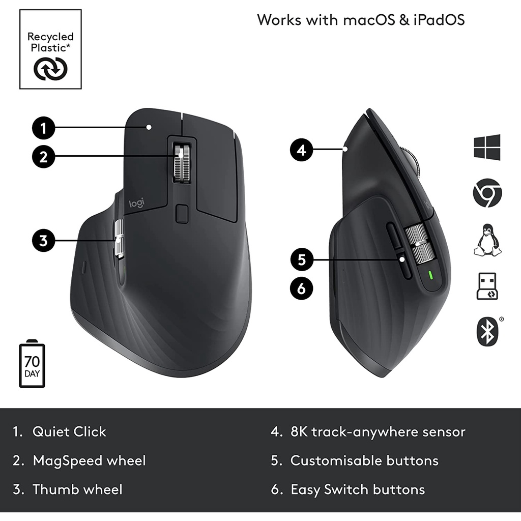 Logitech MX Master 3S Silent Wireless Mouse with Ultra-fast Scrolling, Ergo, 8K DPI, Track on Glass, Long Battery Life