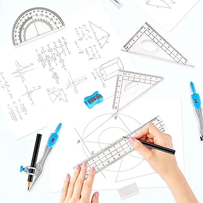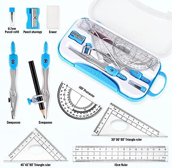 10 Pcs Math Geometry Set: 2 Metal Study Compasses, 2 Triangles (45° & 30°/60°), 6" Ruler, 4" Protractor, Pencil for Compass, Pencil Sharpener, Eraser, Pencil Lead Refill