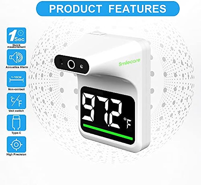 Wall Mounted Thermometer, SmileCare Non-Contact Digital Automatic Infrared Wall Mount Forehead Thermometer for Public Place , Digital Accurate Instant Readings with LCD Display and Fever Alarm