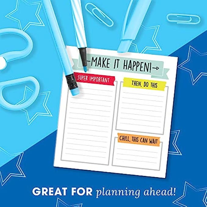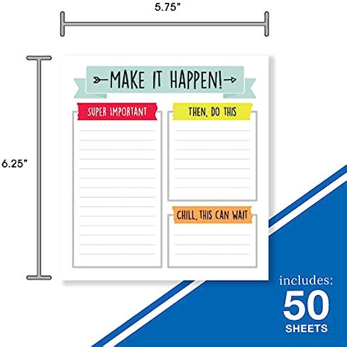 What’s Included: 50 lined pages are included with 3 organized sections: “Super Important”, “Then, Do This”, and “Chill, This Can Wait” to organize your needs by priority. A “Make It Happen!” inspirational quote is featured at the top of each page