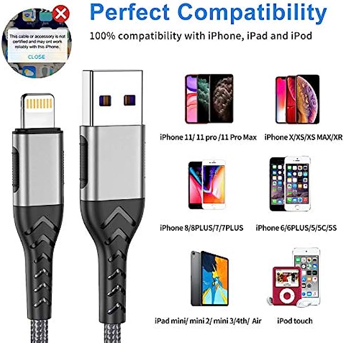 • √【MFi Certified DURABLE DESIGN】: MFi Certified and built with iPhone's upgarded terminal(Super durable) and smart chipset promise no warning message pops up. Reinforced charger cable with strong SR joint design that have passed 25000+ times bending tests for extra protection and durability.Upgraded 3D aluminum connector and exclusive laser welding technology build the ightning cable more sturdy.