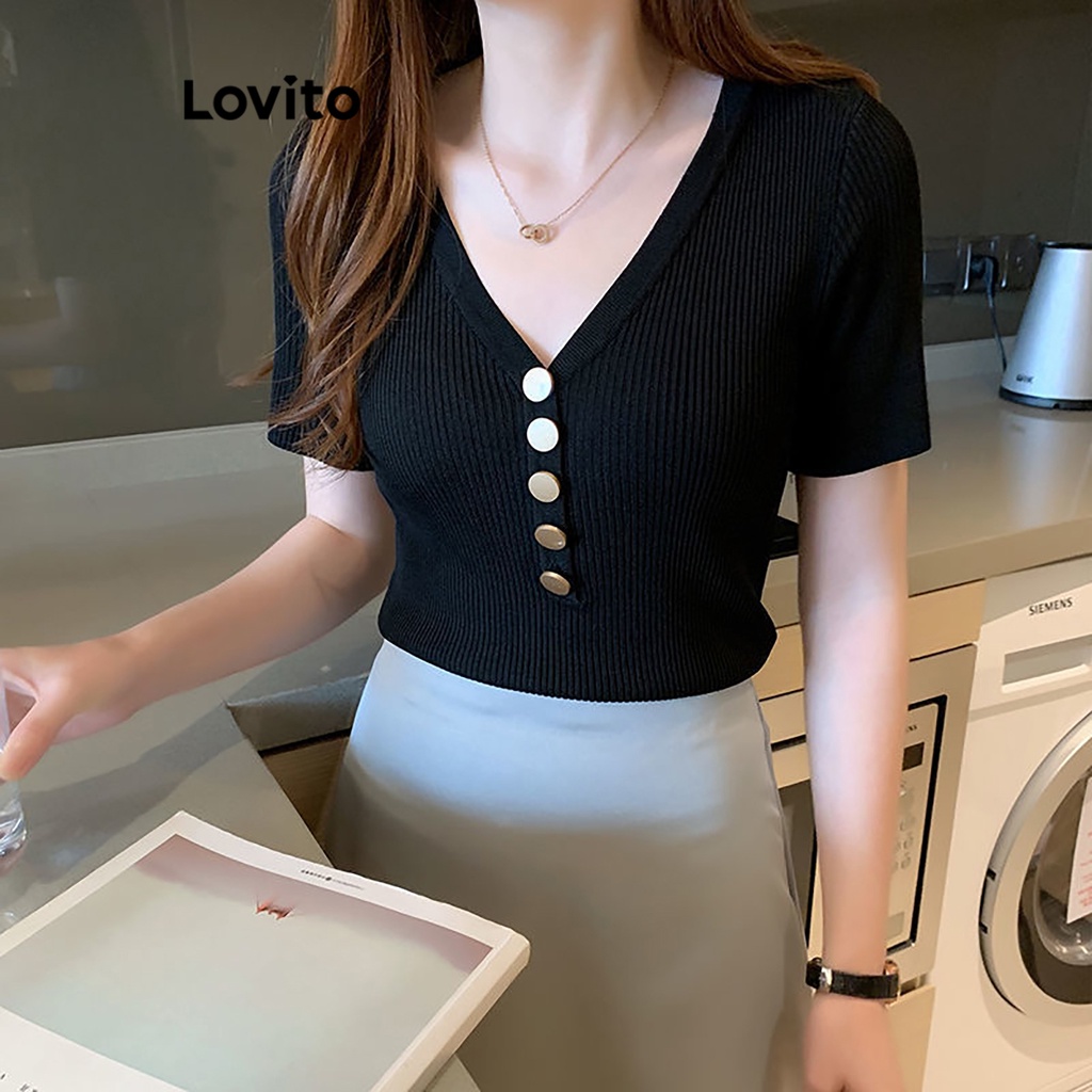 Lovito Casual Plain Button T-Shirt for Women LNL36064 (Apricot/Hot Pink/Green/Black)