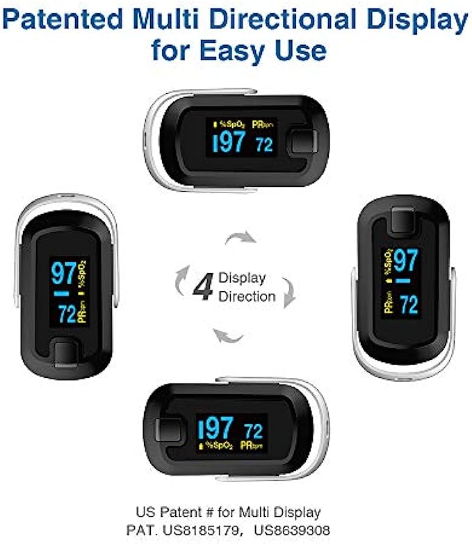 • 【Accurate and Reliable】Accurately determine your SpO2 (blood oxygen saturation levels) and pulse rate and strength in 4 directions, 6 display modes, and 10 levels of adjustable brightness.