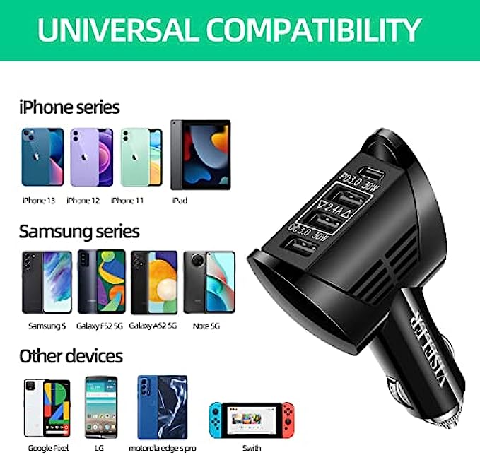 4 USB car charger is wide compatibility, compatible with iPhone series, iPhone 13 12 11 Pro Max X Xr 8 Plus SE2 iPad Pro, Samsung Galaxy series, Galaxy S21 S20 Ultra 5G S10 Note 20 10 A70 A50, Pixel Nexus, LG, Huawei, tablets etc.
