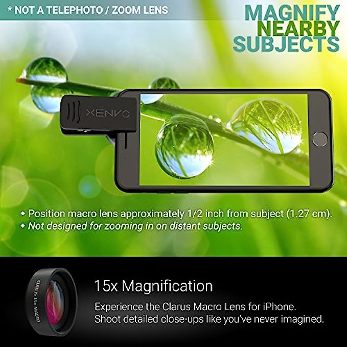 • ✔ CLARUS 15x MACRO LENS - MARVEL YOUR SENSES. MAGNIFY NEARBY SUBJECTS FOR BREATHTAKING, SUPER CLOSE-UP PHOTOS: Capture all the intricacies and details with precision-focus for razor crisp macro photos every time. (For best results, position macro lens approximately 1/2 inch from subject. Not designed for zooming in on distant subjects.) THE TRUGRIP LENS CLIP offers SUPERIOR GRIPPING POWER to fasten your lenses to your cell phone when you're in action mode, framing your next perfect shot.