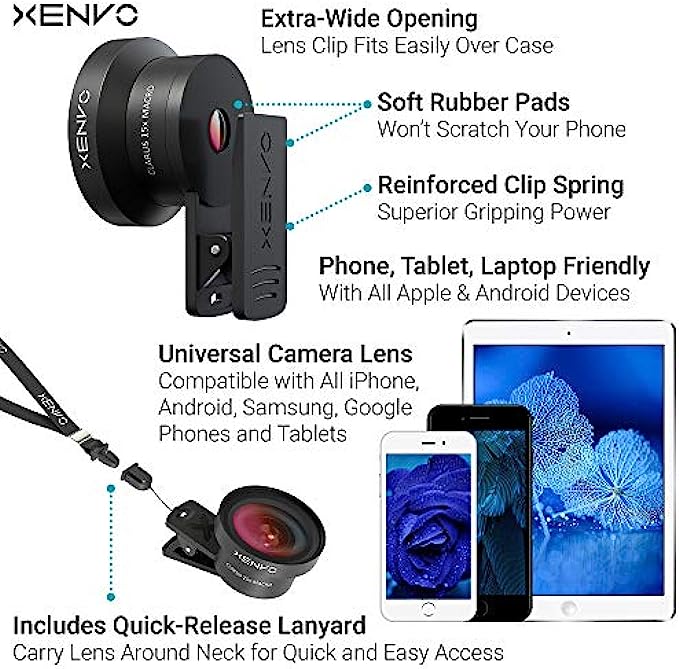 • ✔ COMPATIBLE WITH ALL SMARTPHONES, TABLETS, and LAPTOPS including ALL iPhone models, Samsung Galaxy and Note, Google Pixel, Huawei and more. CONTENTS INCLUDE: TruView 0.45x Wide Angle Lens, Clarus 15x Macro Lens, TruGrip Lens Clip, GlowClip Mini Rechargeable LED Light + Charging Cable, Quick-Release Lanyard, DuraCase, EasyClip, Cleaning Cloth and LIFETIME WARRANTY.